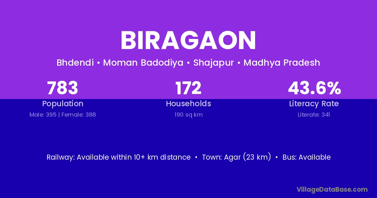 Agar (23 km) is the nearest town to Biragaon village for major economic activities and is located approximately 23 km away.