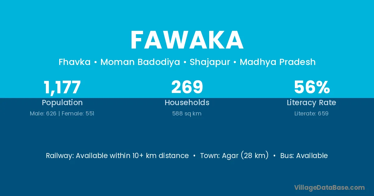 Agar (28 km) is the nearest town to Fawaka village for major economic activities and is located approximately 28 km away.