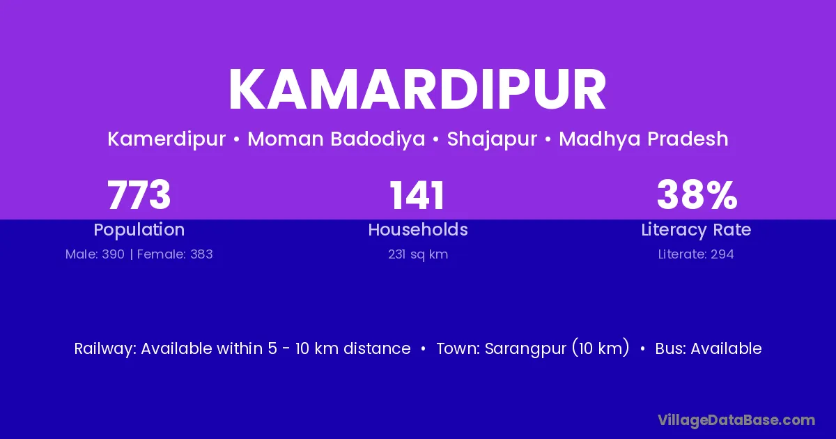 Sarangpur (10 km) is the nearest town to Kamardipur village for major economic activities and is located approximately 10 km away.
