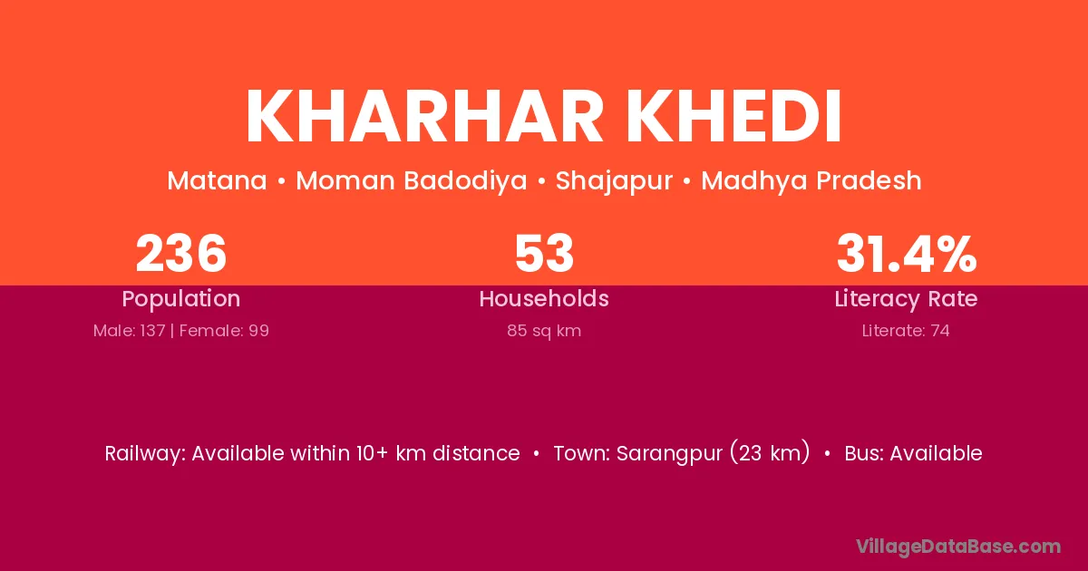 Sarangpur (23 km) is the nearest town to Kharhar Khedi village for major economic activities and is located approximately 23 km away.