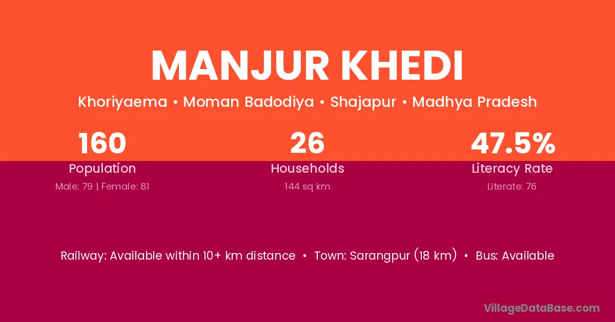 Sarangpur (18 km) is the nearest town to Manjur Khedi village for major economic activities and is located approximately 18 km away.