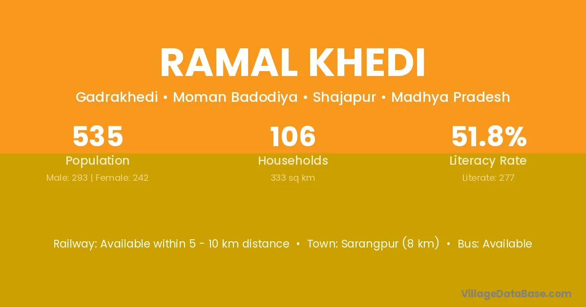 Sarangpur (8 km) is the nearest town to Ramal Khedi village for major economic activities and is located approximately 8 km away.