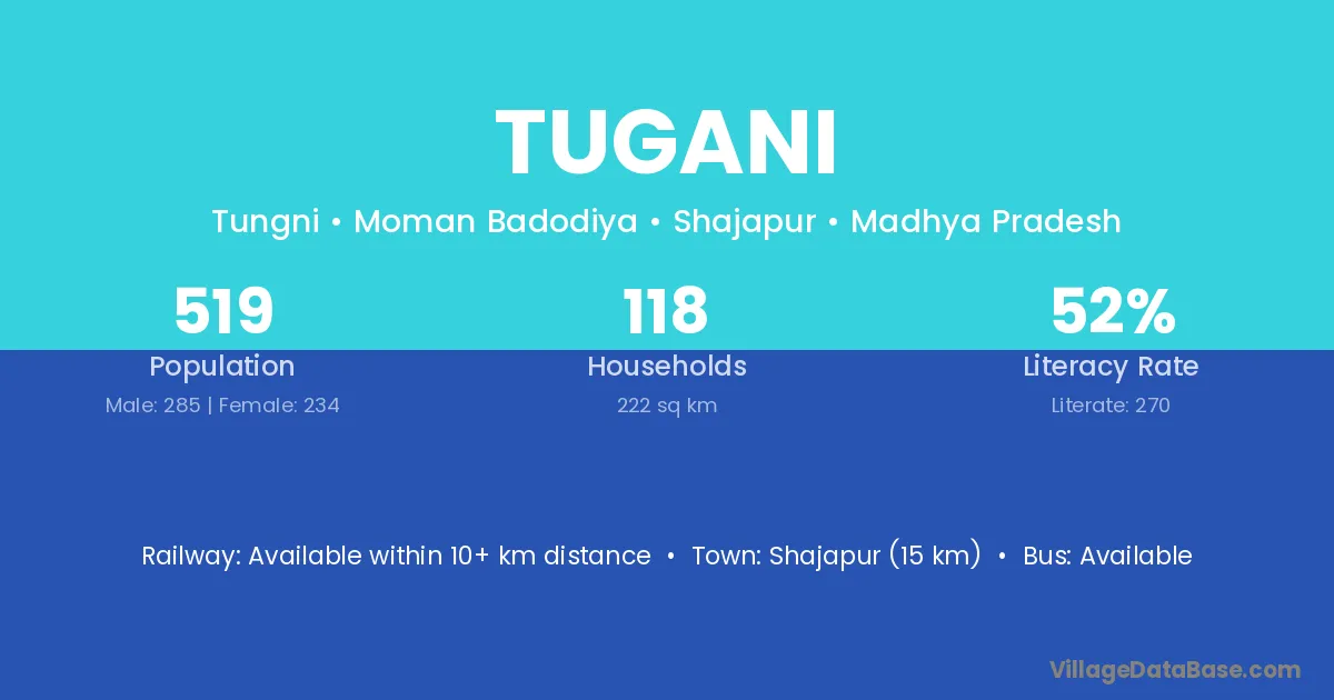 Shajapur (15 km) is the nearest town to Tugani village for major economic activities and is located approximately 15 km away.
