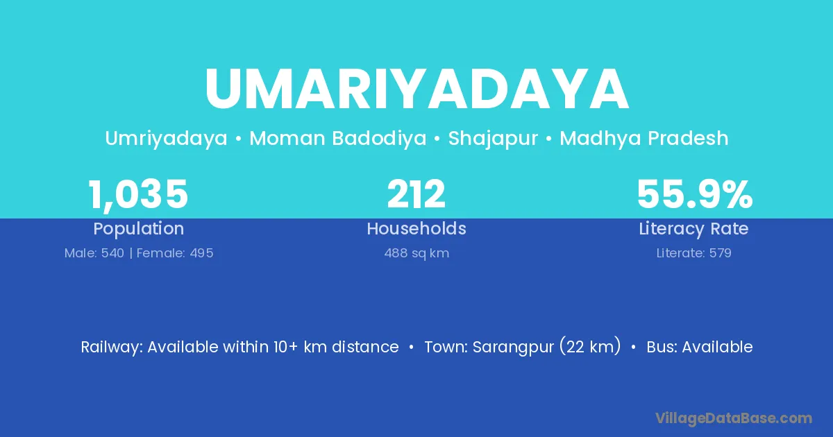 Sarangpur (22 km) is the nearest town to Umariyadaya village for major economic activities and is located approximately 22 km away.