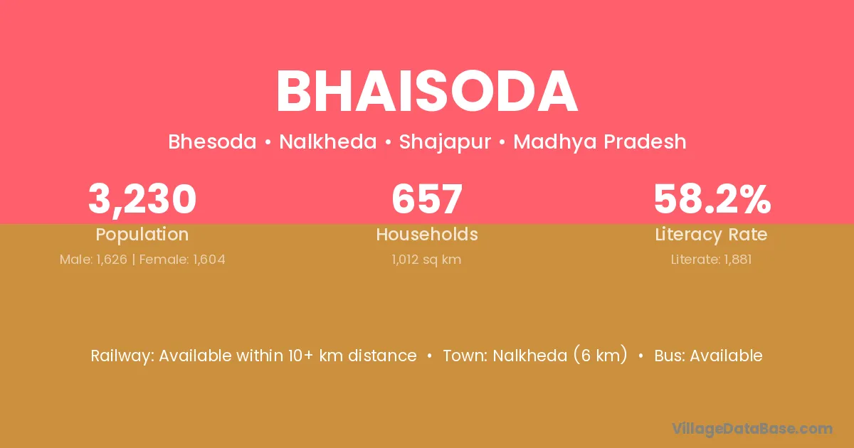 Nalkheda (6 km) is the nearest town to Bhaisoda village for major economic activities and is located approximately 6 km away.