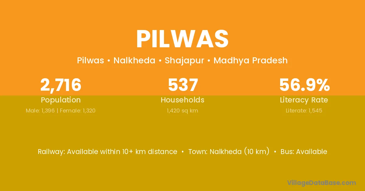 Nalkheda (10 km) is the nearest town to Pilwas village for major economic activities and is located approximately 10 km away.