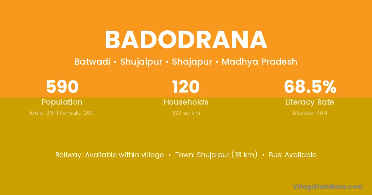 Shujalpur (18 km) is the nearest town to Badodrana village for major economic activities and is located approximately 18 km away.