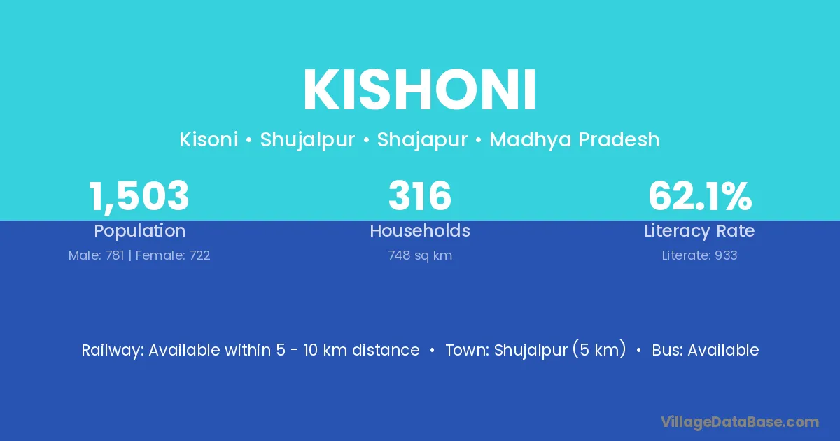 Shujalpur (5 km) is the nearest town to Kishoni village for major economic activities and is located approximately 5 km away.