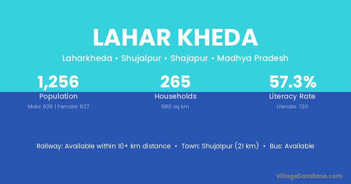 Shujalpur (21 km) is the nearest town to Lahar Kheda village for major economic activities and is located approximately 21 km away.