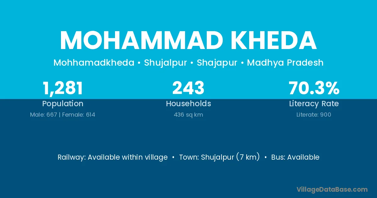 Shujalpur (7 km) is the nearest town to Mohammad Kheda village for major economic activities and is located approximately 7 km away.