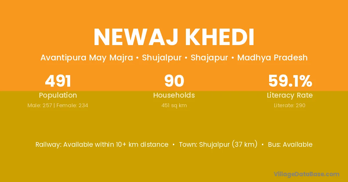 Shujalpur (37 km) is the nearest town to Newaj Khedi village for major economic activities and is located approximately 37 km away.