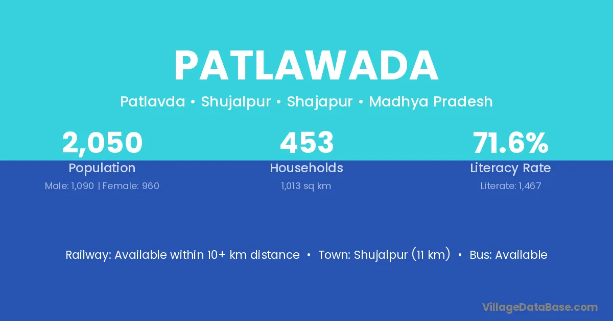 Shujalpur (11 km) is the nearest town to Patlawada village for major economic activities and is located approximately 11 km away.