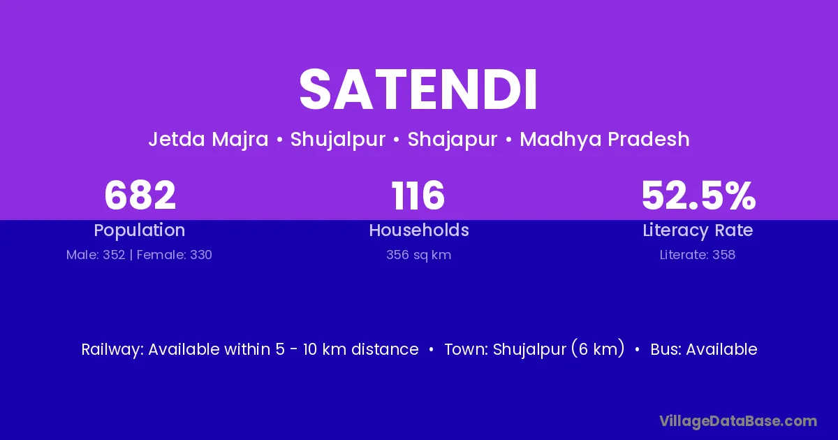 Shujalpur (6 km) is the nearest town to Satendi village for major economic activities and is located approximately 6 km away.