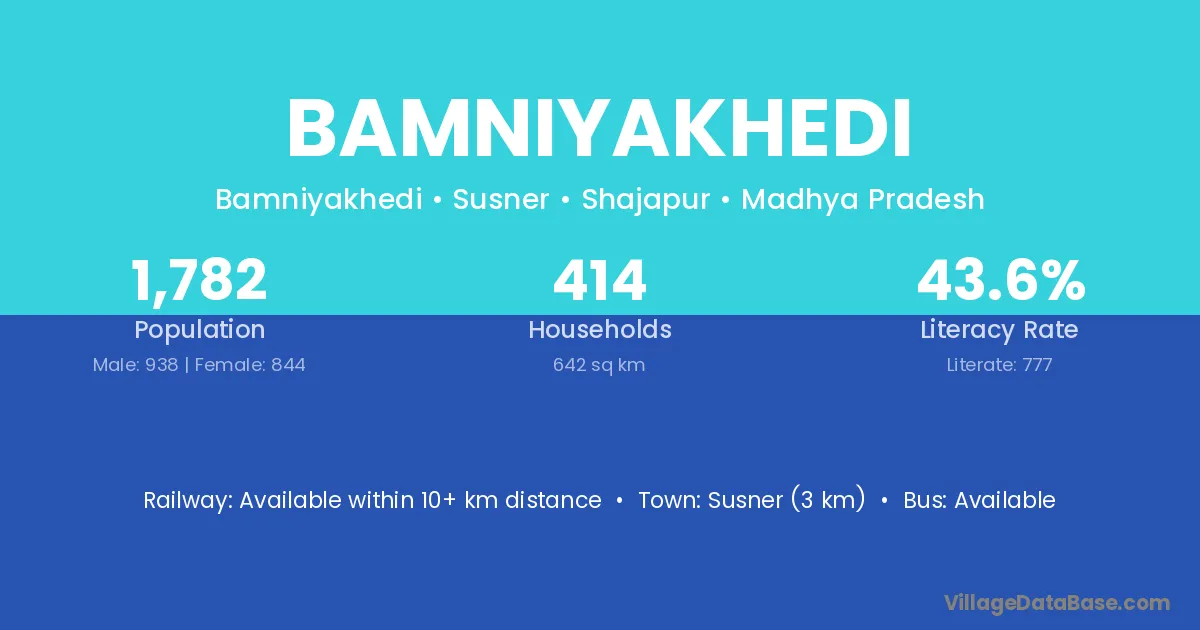 Susner (3 km) is the nearest town to Bamniyakhedi village for major economic activities and is located approximately 3 km away.