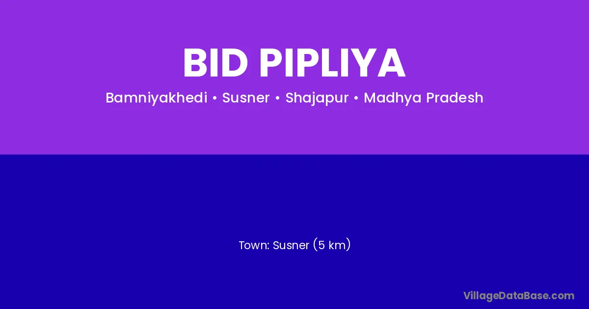 Susner (5 km) is the nearest town to Bid Pipliya village for major economic activities and is located approximately 5 km away.