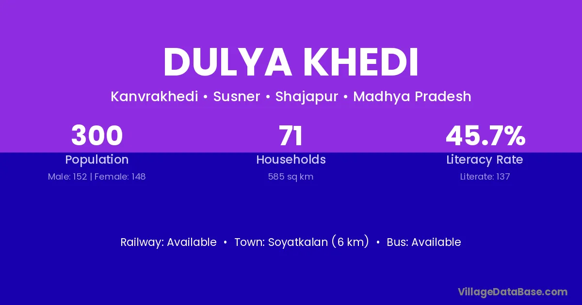 Dulya Khedi village has a total population of 300 people, of which 152 are males and 148 are females.