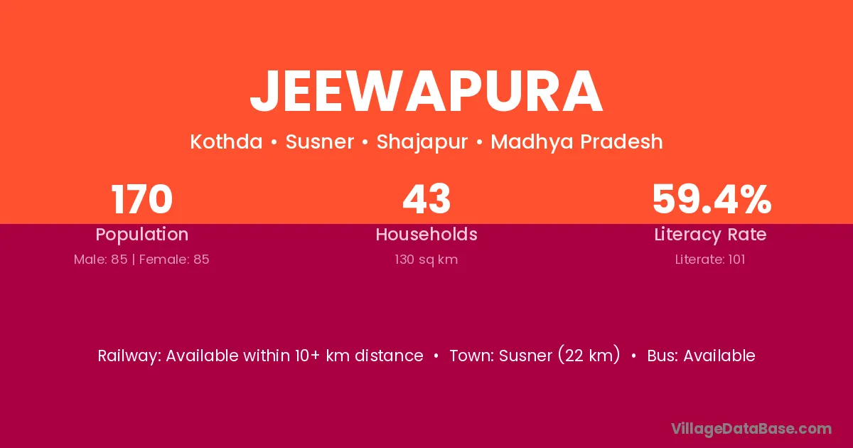 Jeewapura village has a total population of 170 people, of which 85 are males and 85 are females.