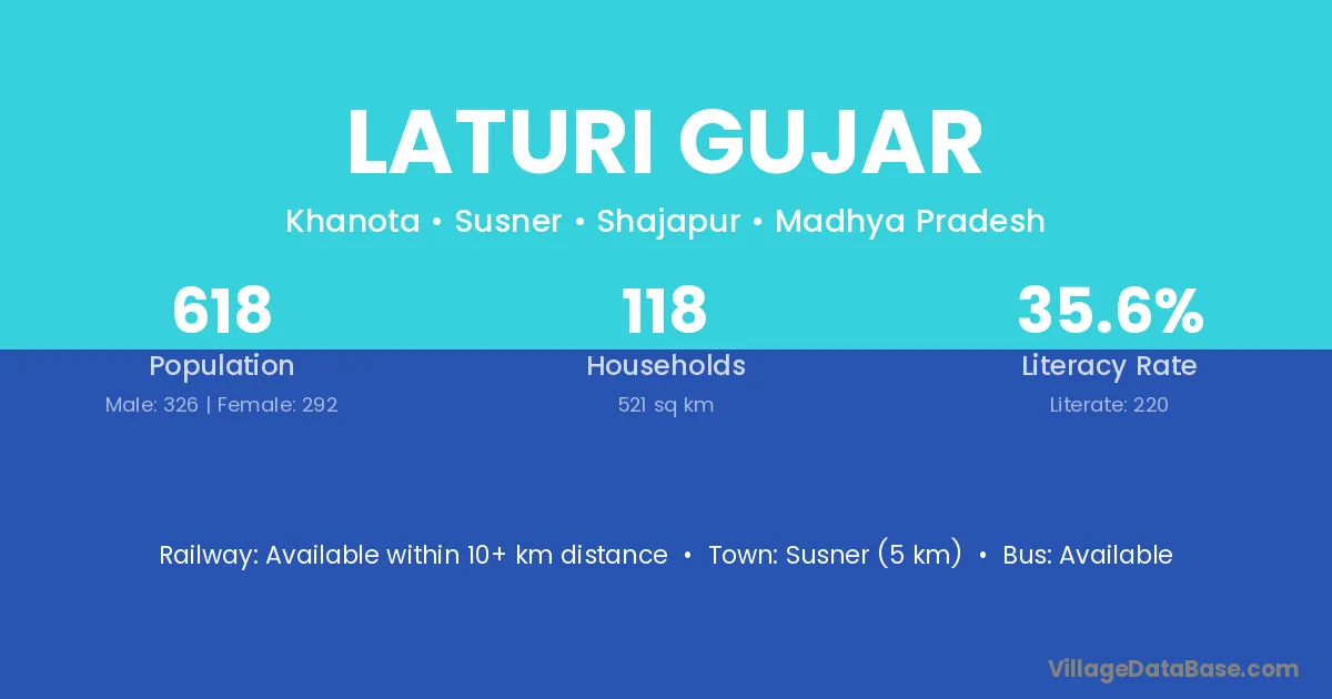 Susner (5 km) is the nearest town to Laturi Gujar village for major economic activities and is located approximately 5 km away.