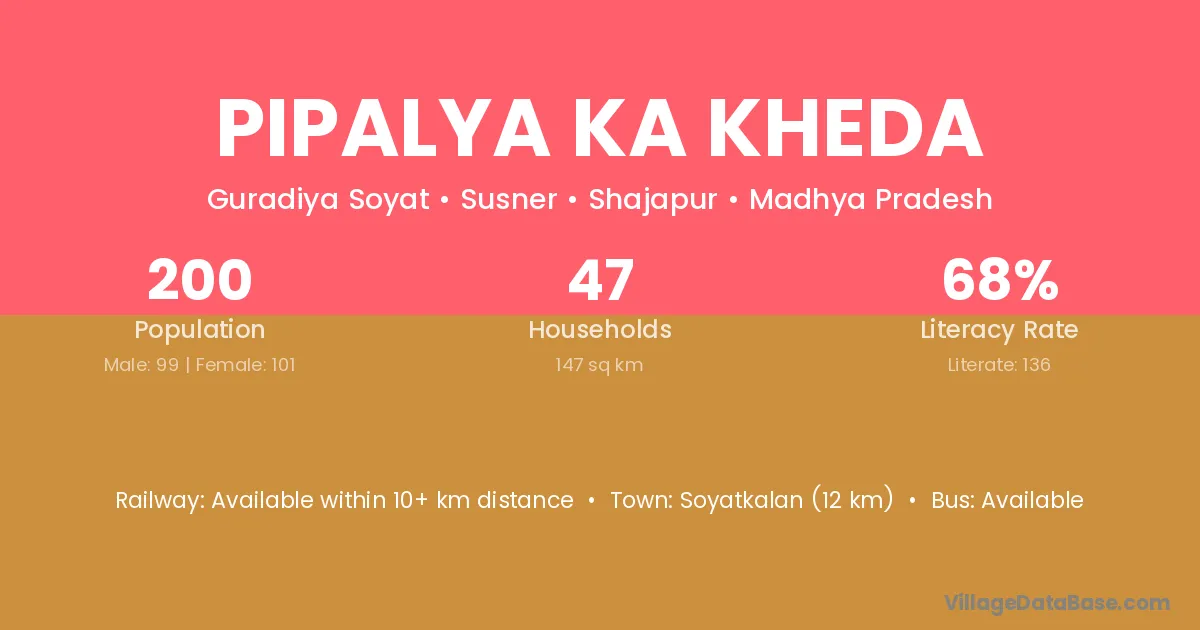 Pipalya Ka Kheda village has a total population of 200 people, of which 99 are males and 101 are females.