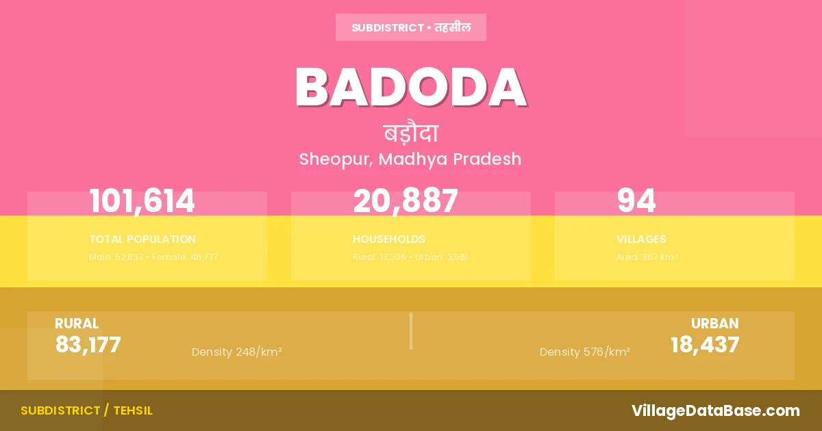 According to the 2011 census The total area of Badoda Tehsil is 367 km², with a population of 101614 people. The population density is 277 inhabitants per square kilometre, and there are approximately 20887 houses in the sub district.