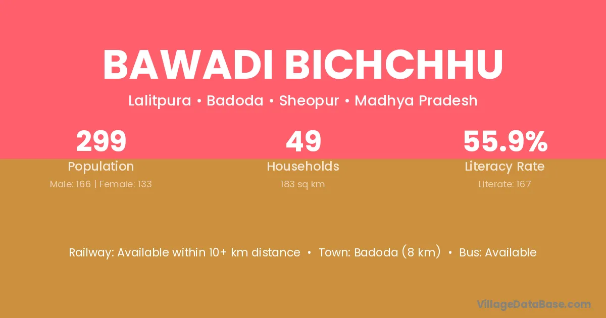 Badoda (8 km) is the nearest town to Bawadi Bichchhu village for major economic activities and is located approximately 8 km away.