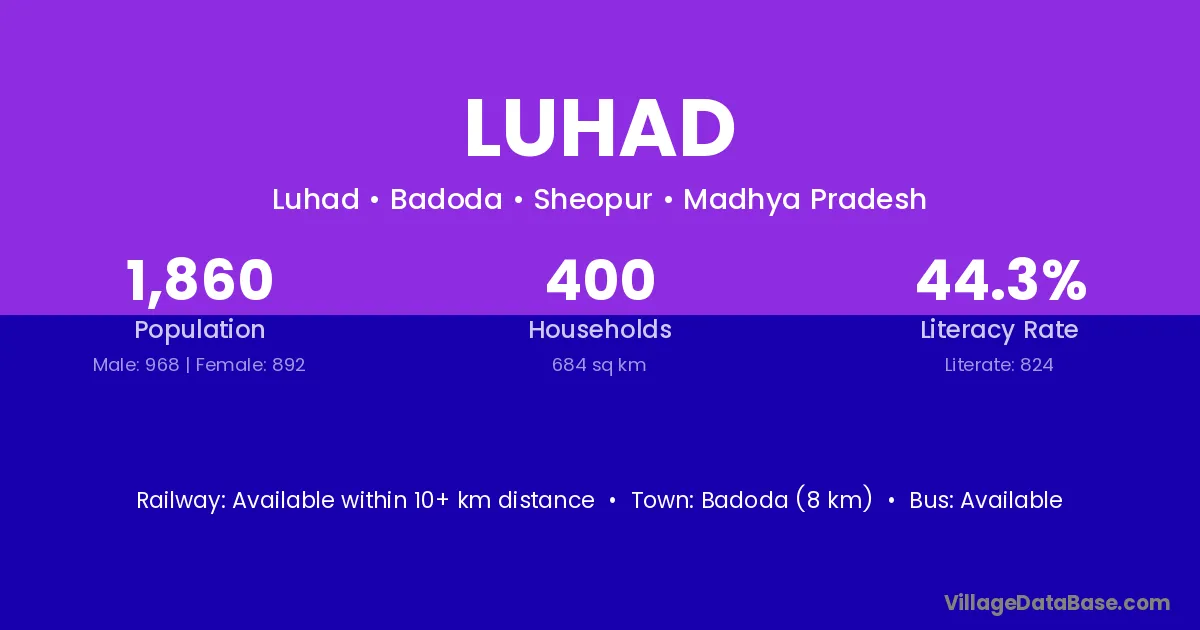 Badoda (8 km) is the nearest town to Luhad village for major economic activities and is located approximately 8 km away.
