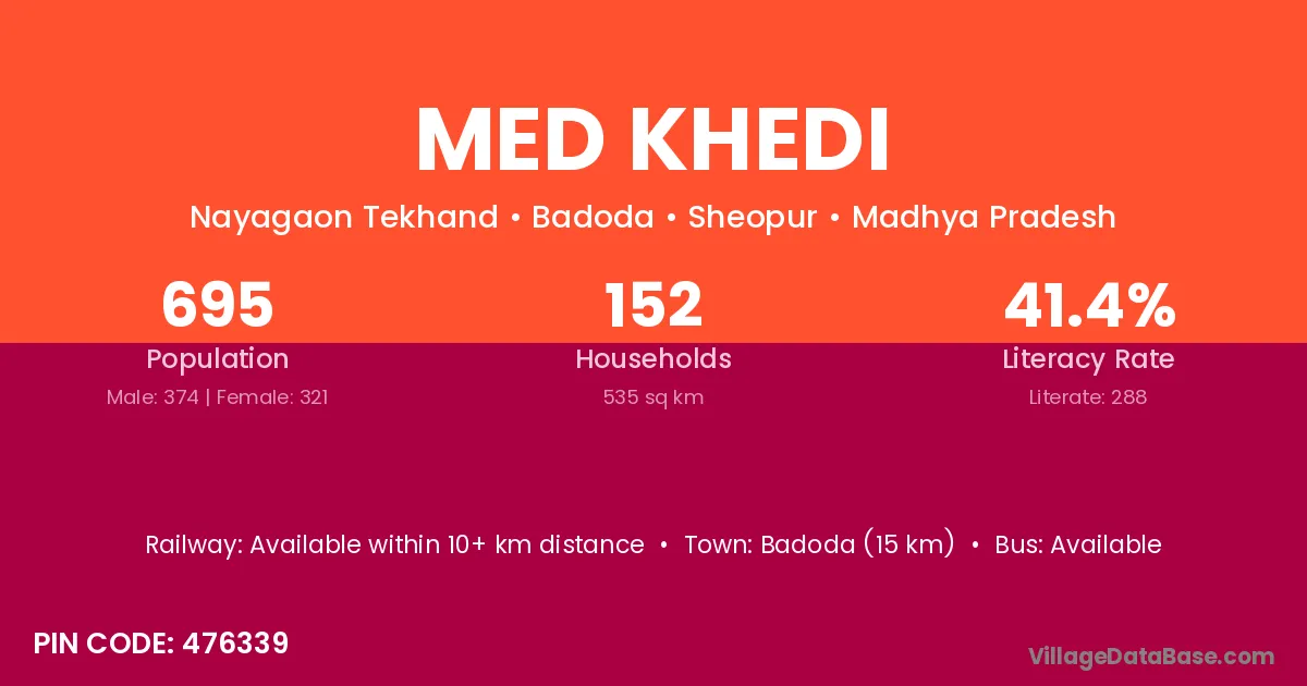 Med Khedi village has a total population of 695 people, of which 374 are males and 321 are females.
