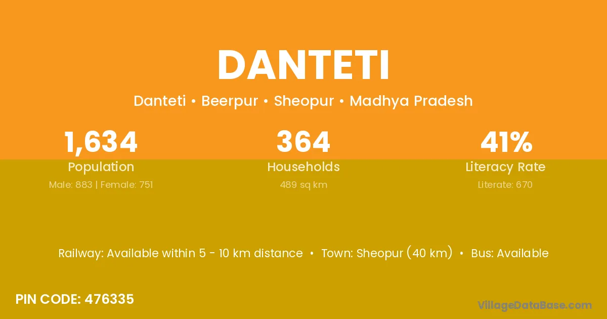 Sheopur (40 km) is the nearest town to Danteti village for major economic activities and is located approximately 40 km away.