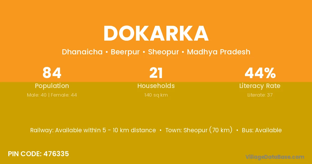 Sheopur (70 km) is the nearest town to Dokarka village for major economic activities and is located approximately 70 km away.
