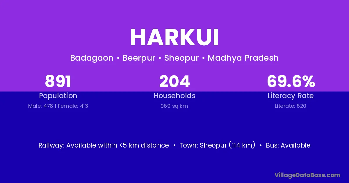 Sheopur (114 km) is the nearest town to Harkui village for major economic activities and is located approximately 114 km away.