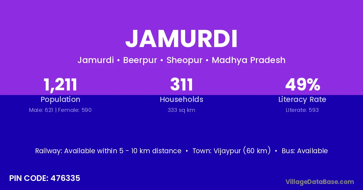 Vijaypur (60 km) is the nearest town to Jamurdi village for major economic activities and is located approximately 60 km away.