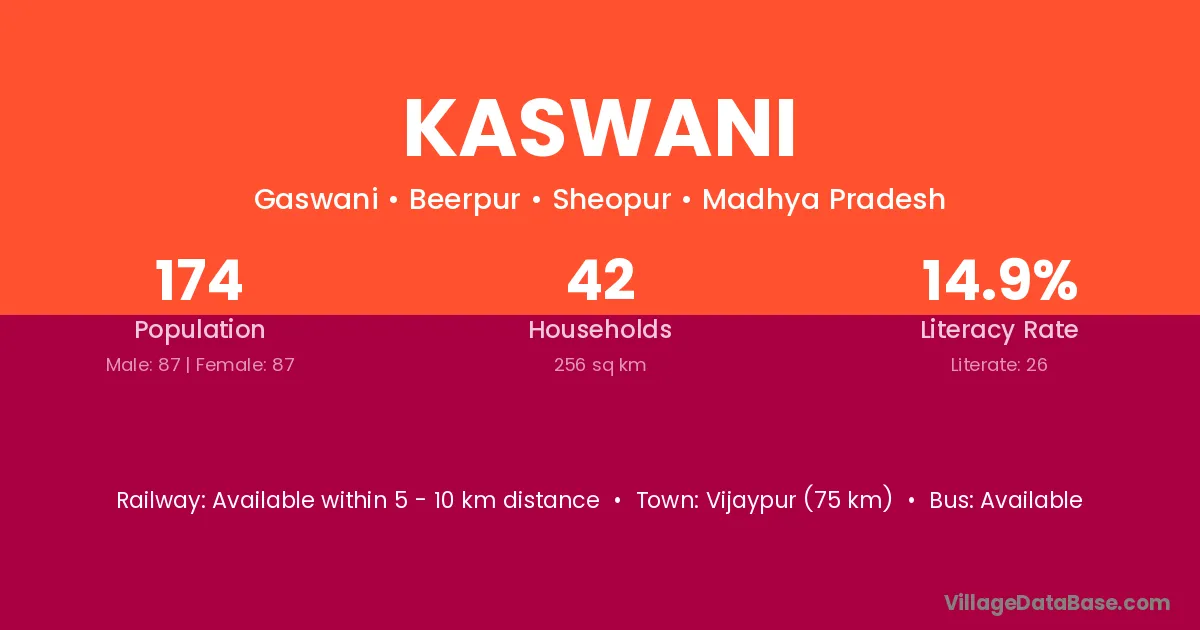 Vijaypur (75 km) is the nearest town to Kaswani village for major economic activities and is located approximately 75 km away.