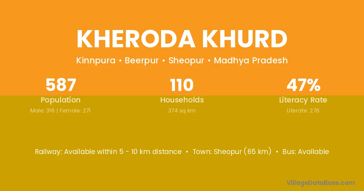 Sheopur (65 km) is the nearest town to Kheroda Khurd village for major economic activities and is located approximately 65 km away.