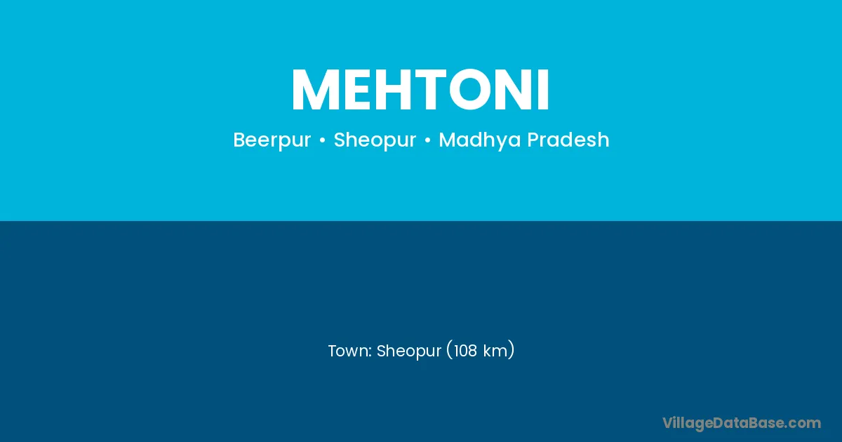 Sheopur (108 km) is the nearest town to Mehtoni village for major economic activities and is located approximately 108 km away.