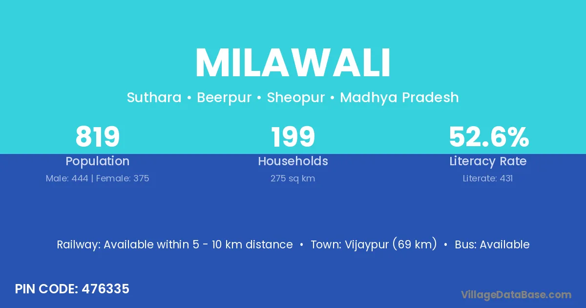 Vijaypur (69 km) is the nearest town to Milawali village for major economic activities and is located approximately 69 km away.