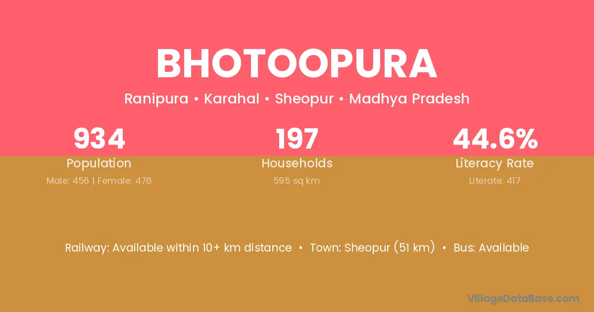 Sheopur (51 km) is the nearest town to Bhotoopura village for major economic activities and is located approximately 51 km away.