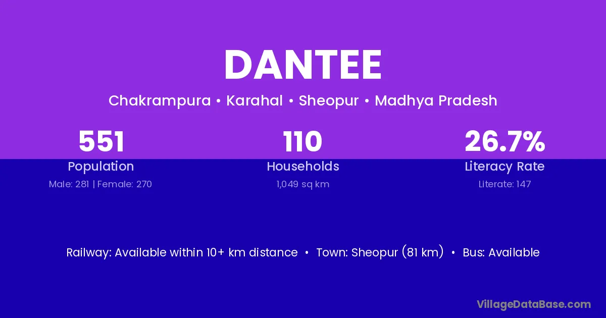 Sheopur (81 km) is the nearest town to Dantee village for major economic activities and is located approximately 81 km away.