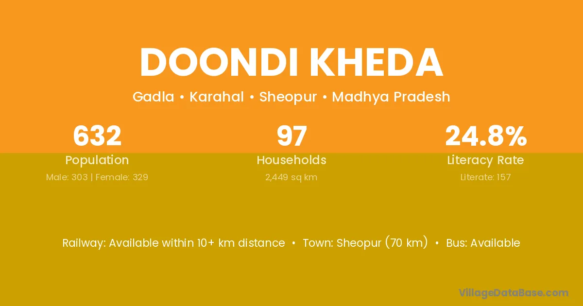 Sheopur (70 km) is the nearest town to Doondi Kheda village for major economic activities and is located approximately 70 km away.