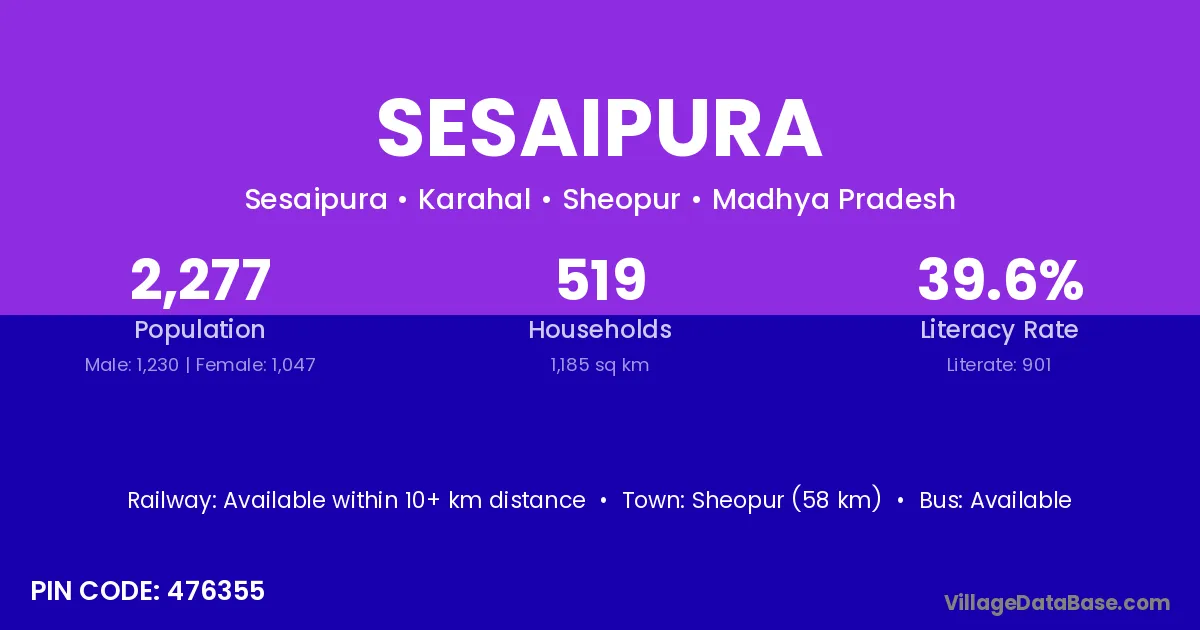 Sheopur (58 km) is the nearest town to Sesaipura village for major economic activities and is located approximately 58 km away.