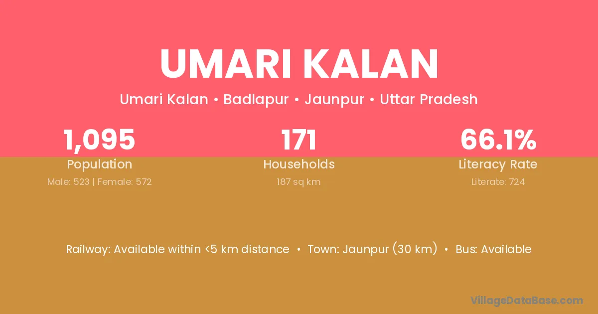 The literacy rate of Umari Kalan village is 34.76%. Male literacy stands at 42.31% and female literacy at 25.95%.