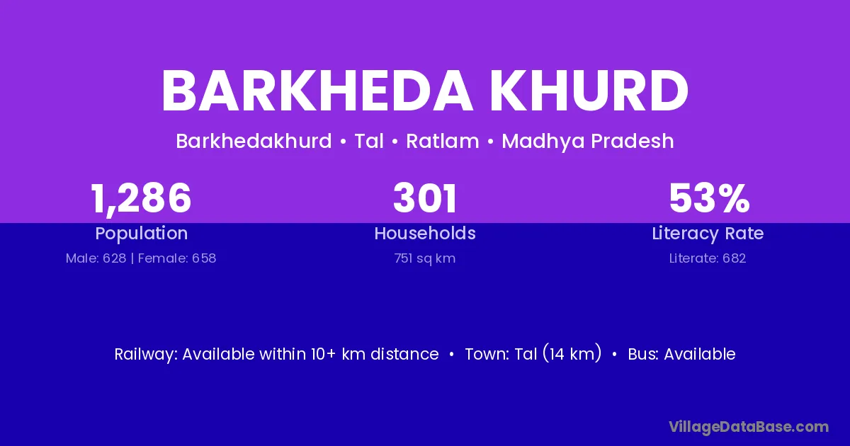 The literacy rate of Barkheda Khurd village is 40.26%. Male literacy stands at 51.24% and female literacy at 28.23%.