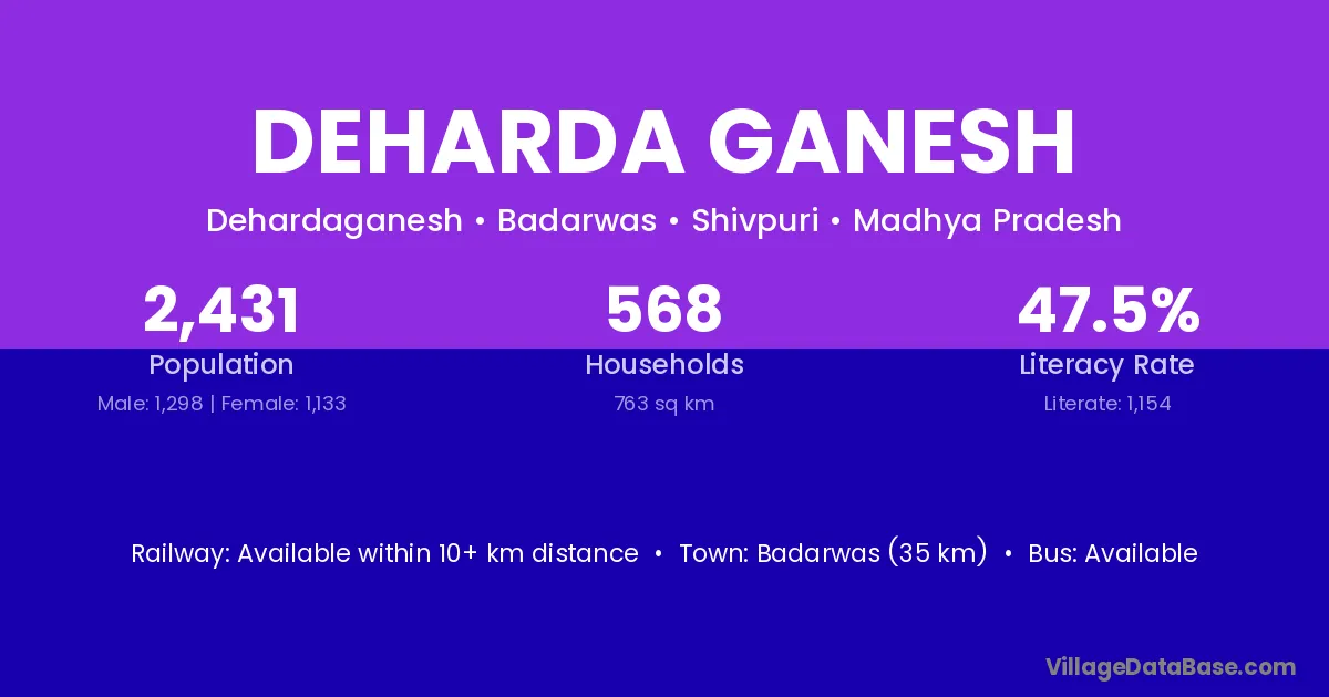 Badarwas (35 km) is the nearest town to Deharda Ganesh village for major economic activities and is located approximately 35 km away.