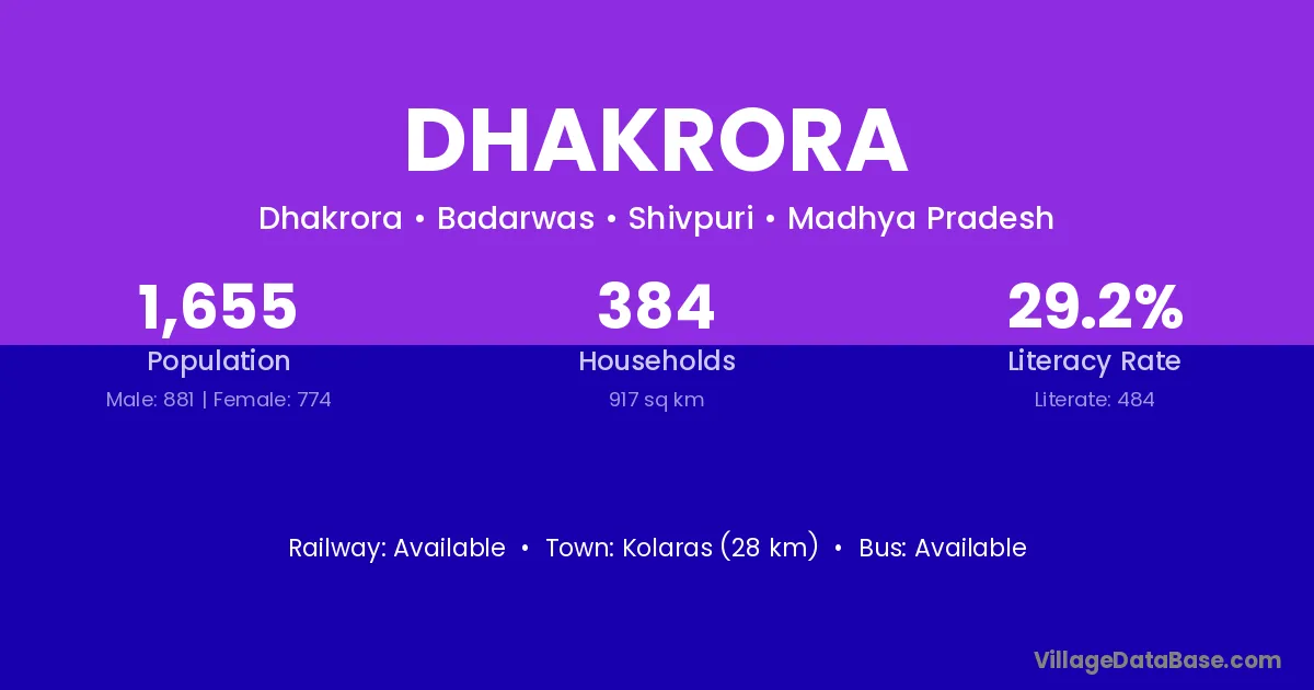 Kolaras (28 km) is the nearest town to Dhakrora village for major economic activities and is located approximately 28 km away.