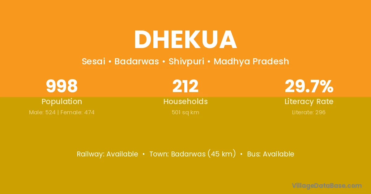 Dhekua village has a total population of 998 people, of which 524 are males and 474 are females.