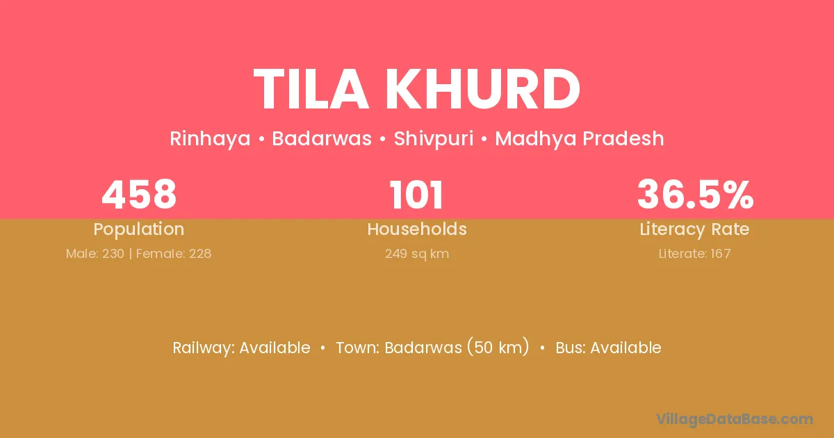 Tila Khurd village has a total population of 458 people, of which 230 are males and 228 are females.