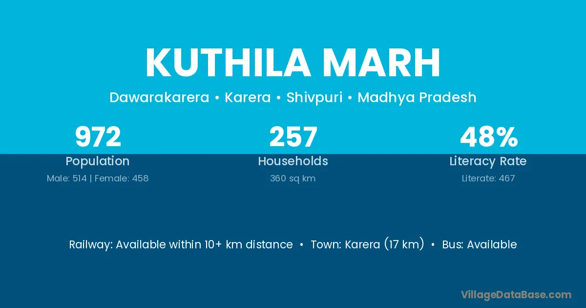 Karera (17 km) is the nearest town to Kuthila Marh village for major economic activities and is located approximately 17 km away.