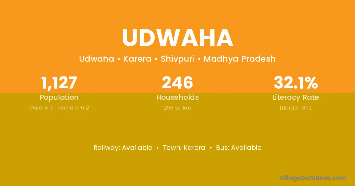 Udwaha village has a total population of 1,127 people, of which 615 are males and 512 are females.