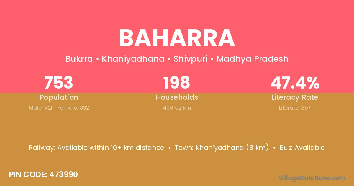 Khaniyadhana (8 km) is the nearest town to Baharra village for major economic activities and is located approximately 8 km away.