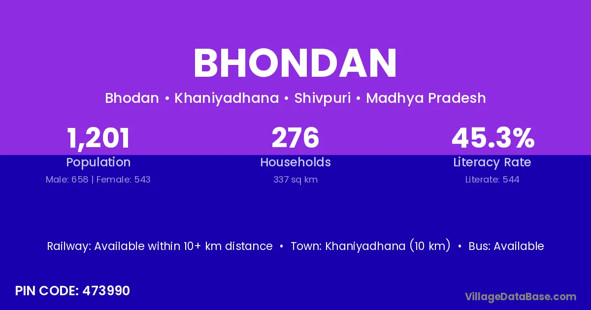 Khaniyadhana (10 km) is the nearest town to Bhondan village for major economic activities and is located approximately 10 km away.