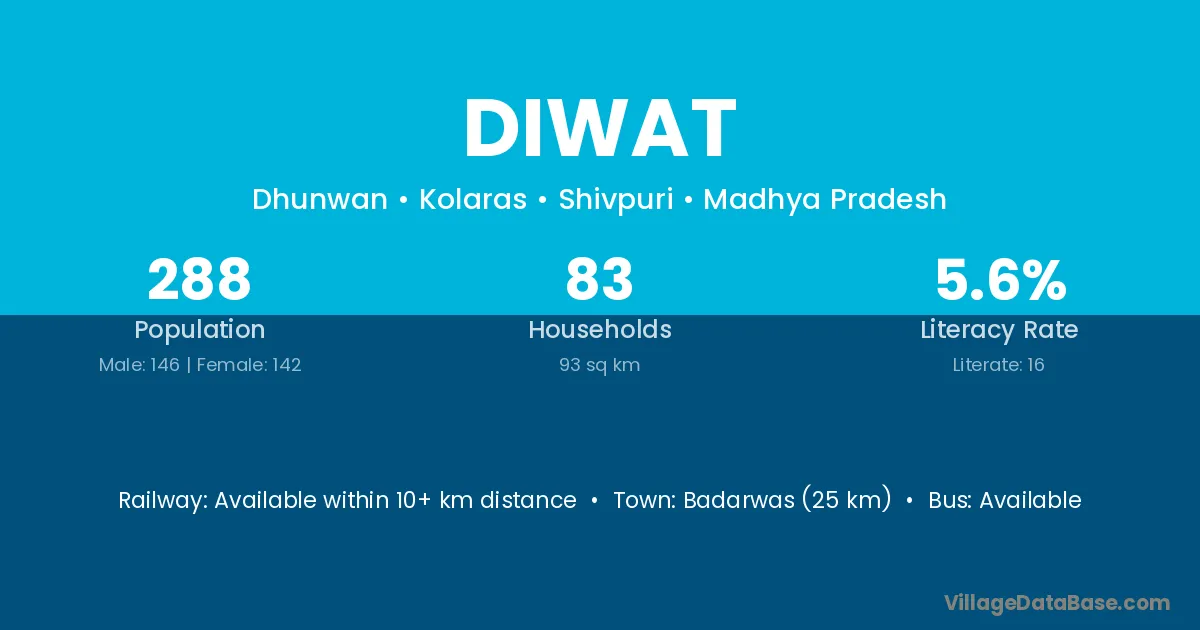 Badarwas (25 km) is the nearest town to Diwat village for major economic activities and is located approximately 25 km away.